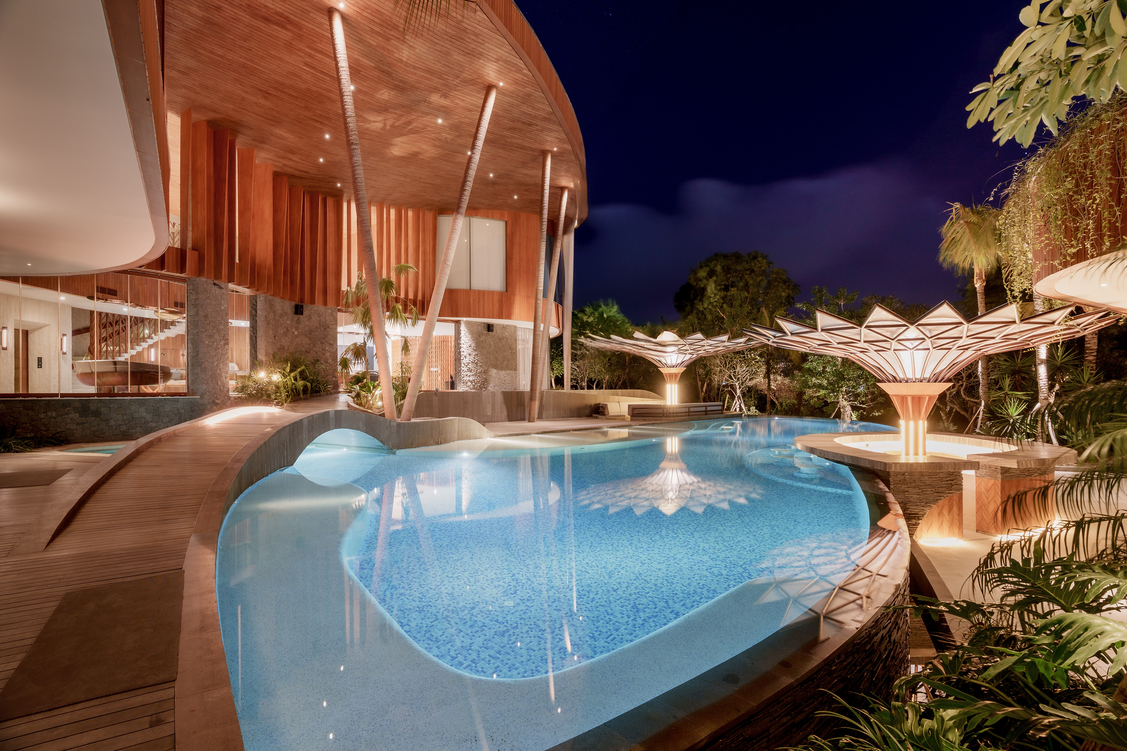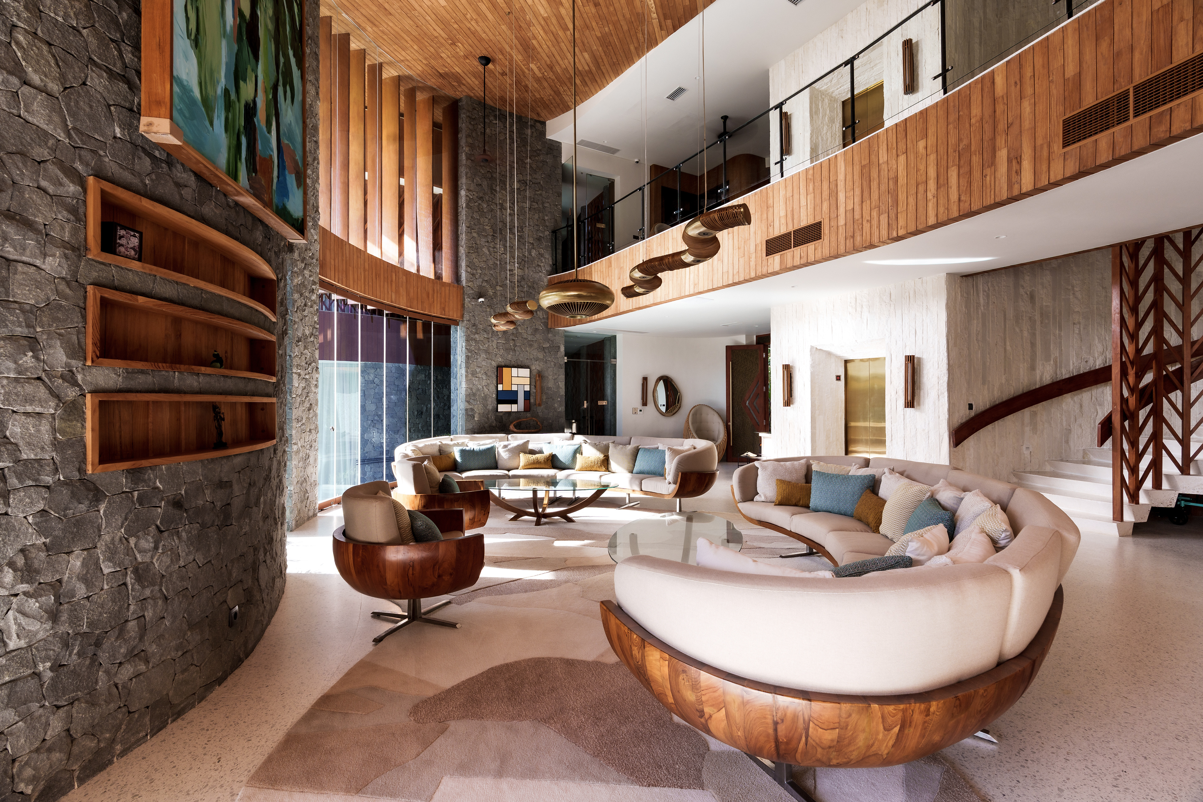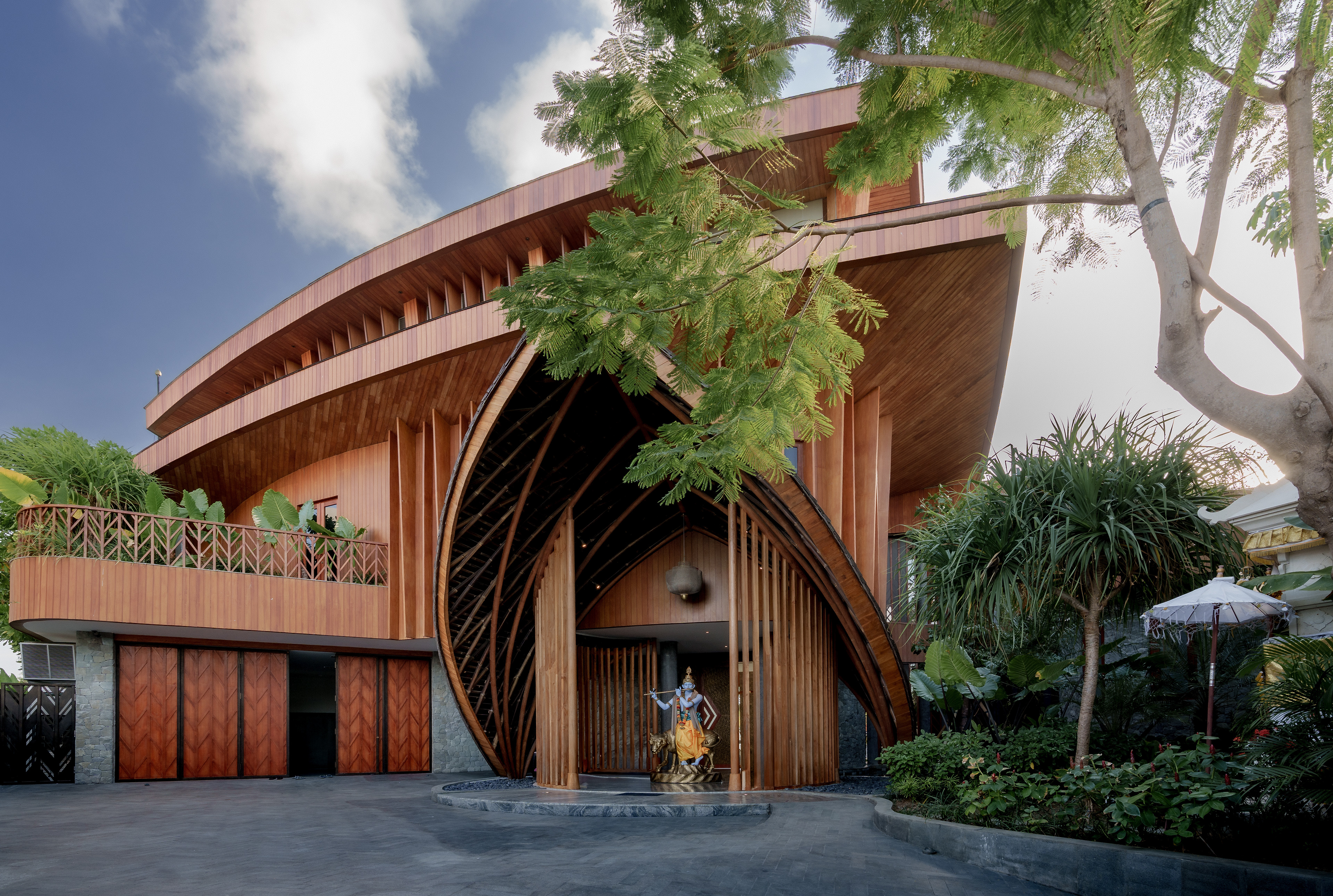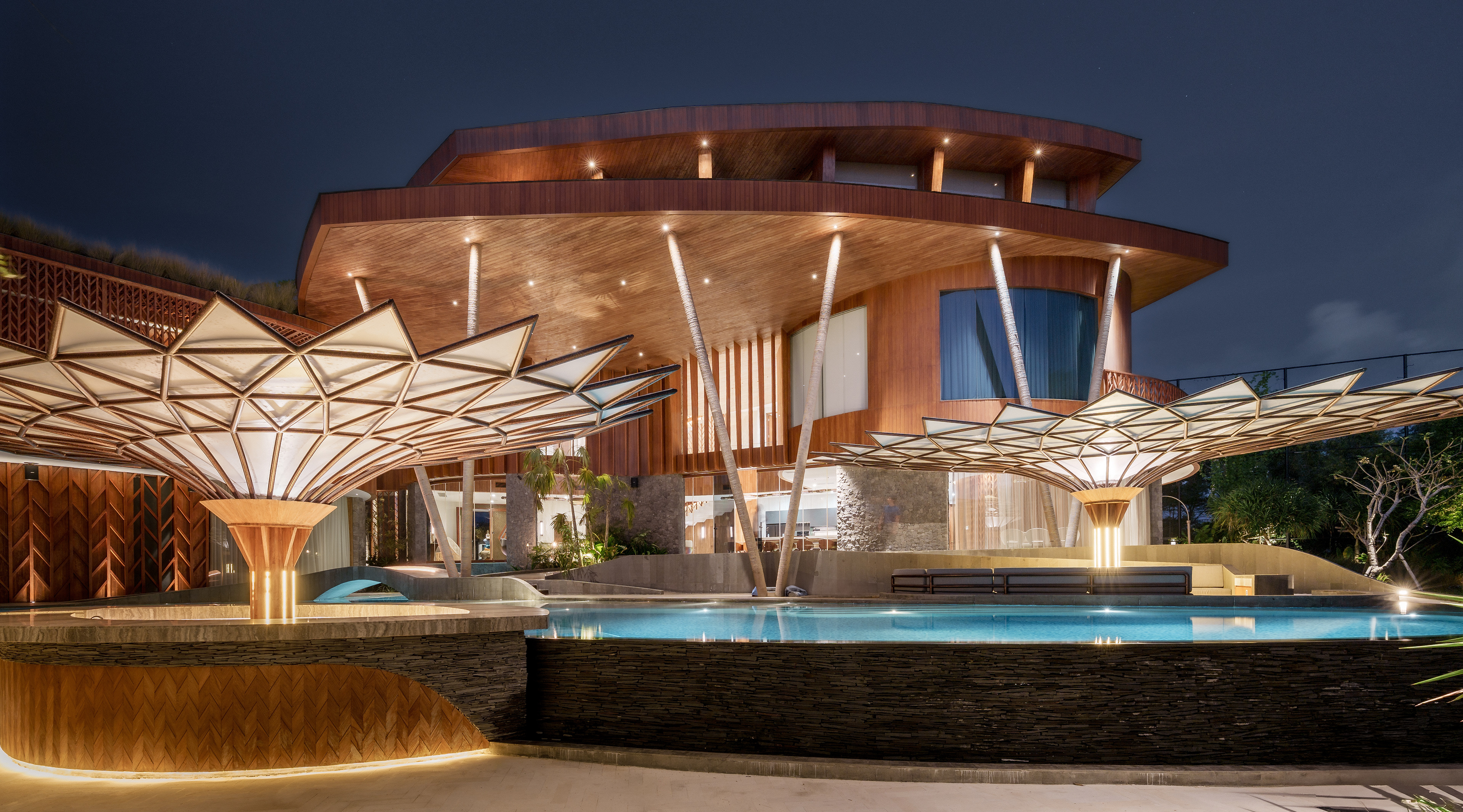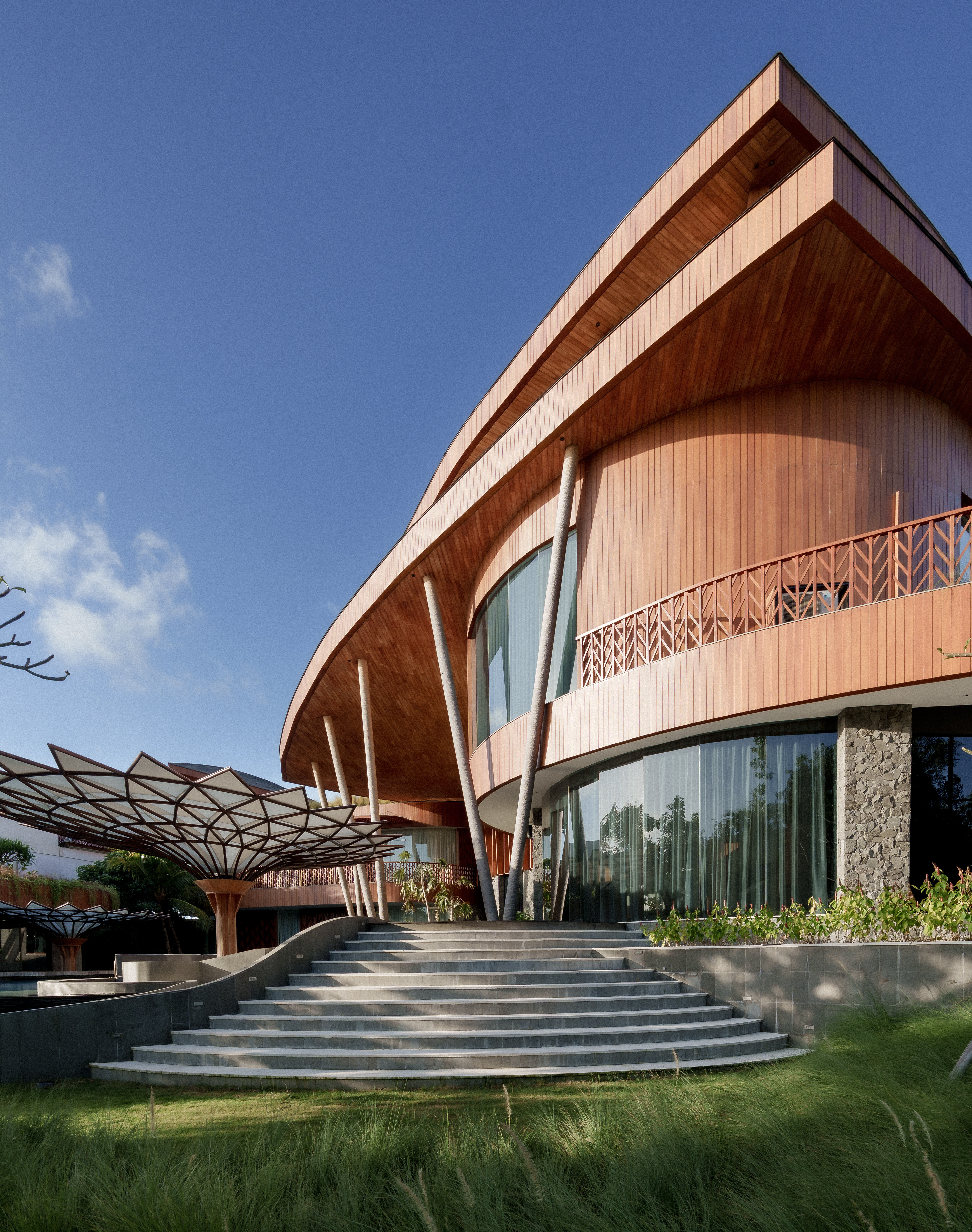 A structure has risen that refuses to be categorized — part sculpture, part sanctuary, entirely singular. Conceived with the sweeping ambition of a ship's prow and the reverence of a Balinese temple, this multi-story private villa wraps its curved, timber-clad façade around a double-volume living hall where semi-circular cream sofas orbit beneath soaring wood-slatted ceilings, as though the architecture itself choreographs the human experience within it. Project by Inspiral Architect.