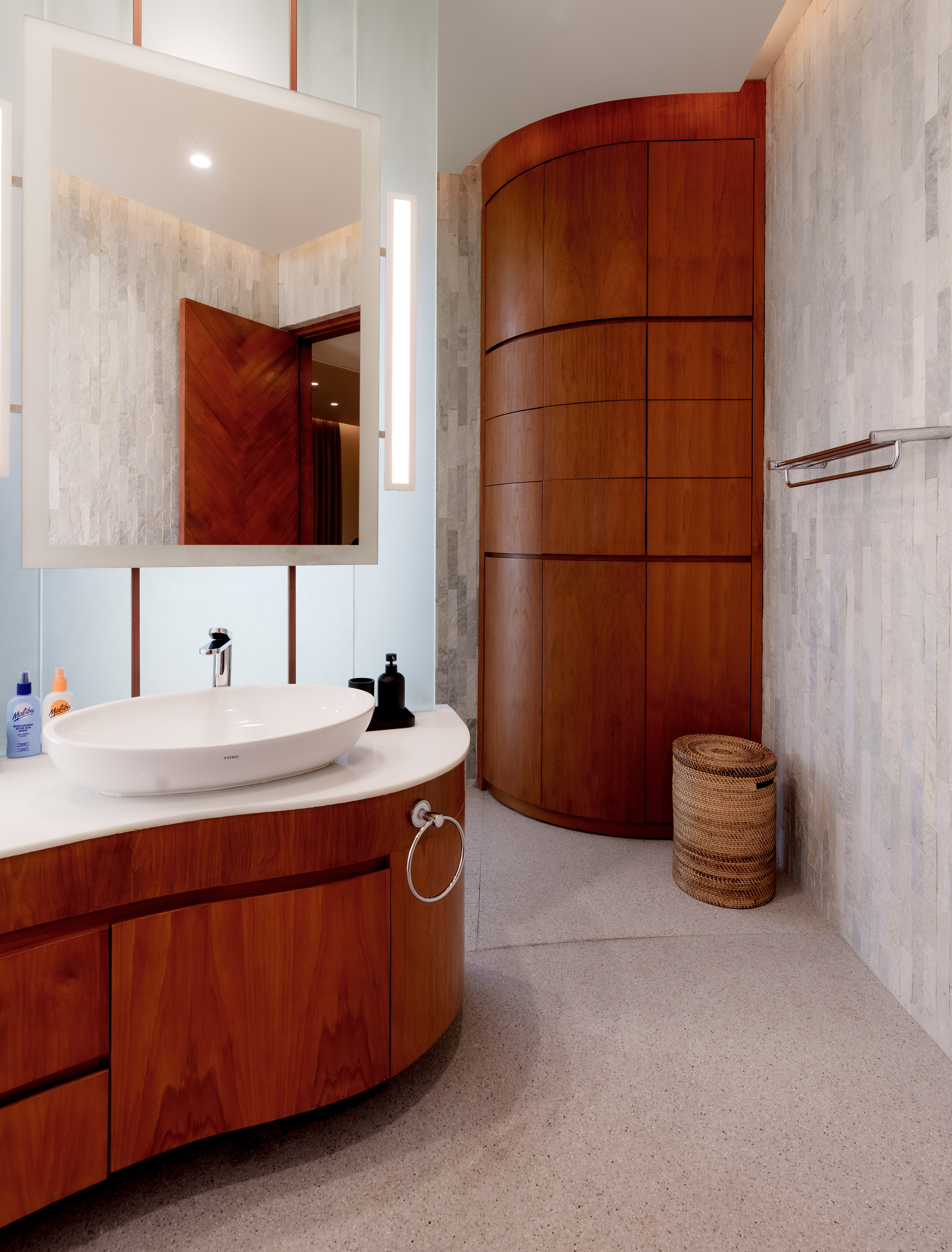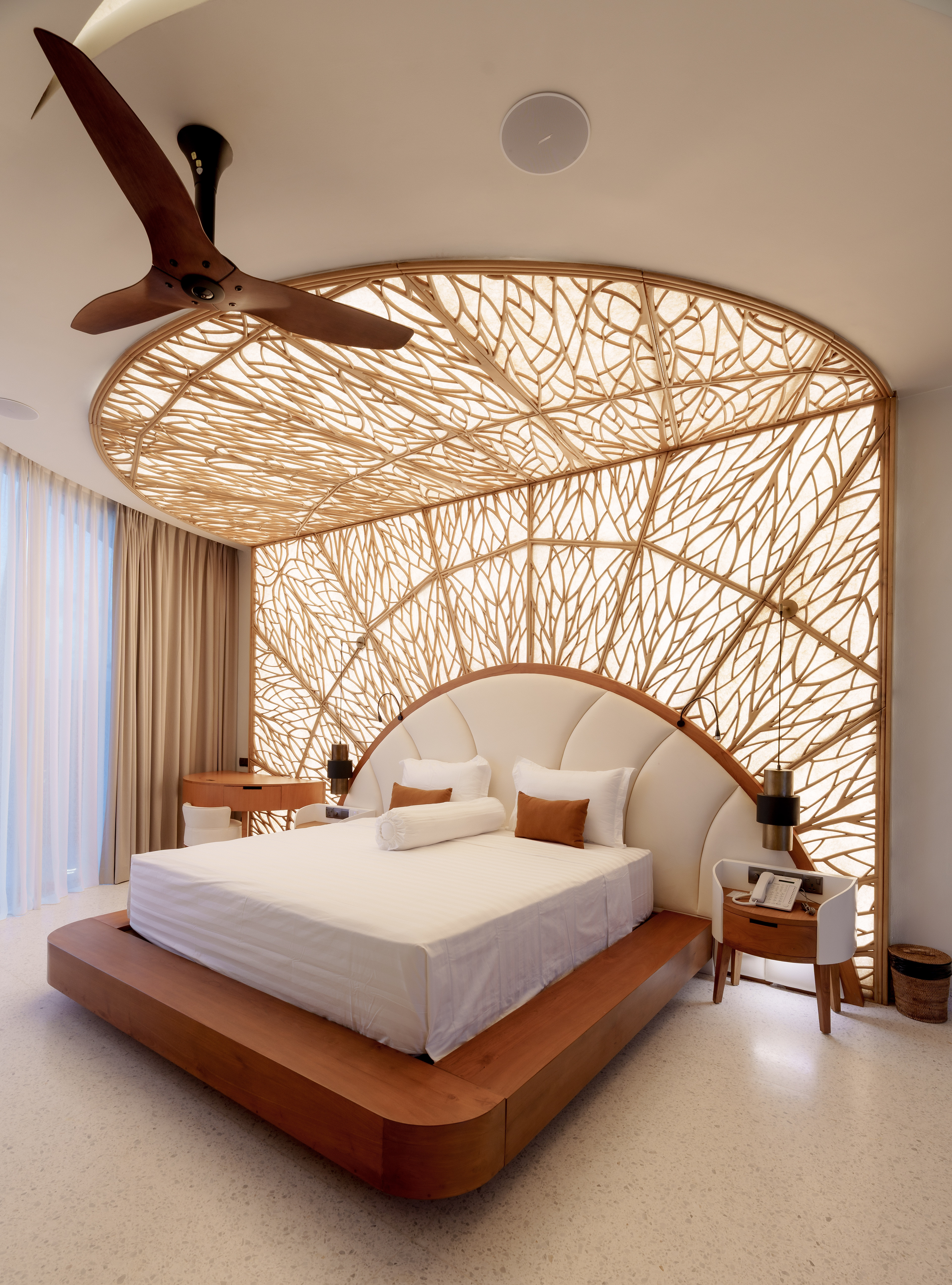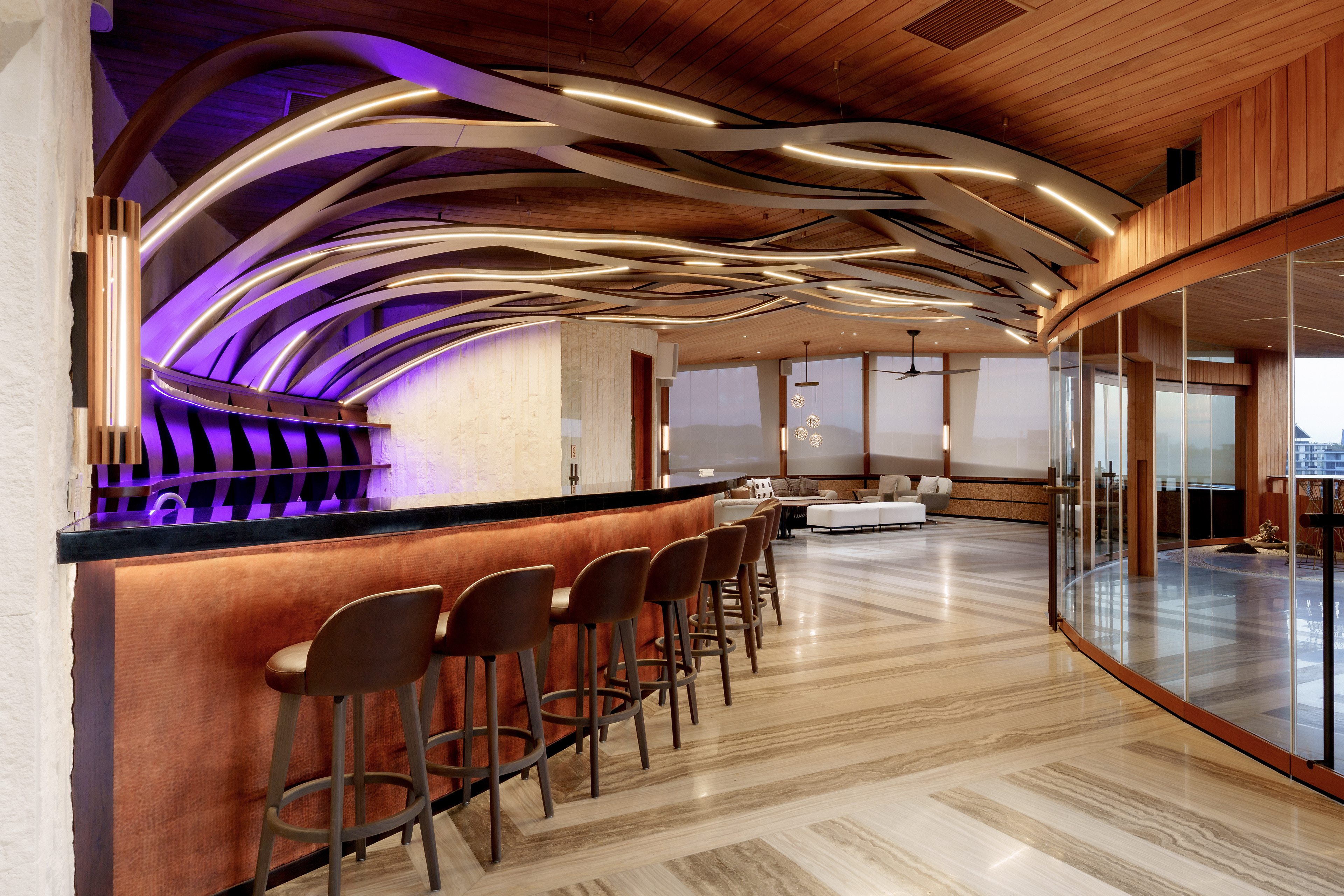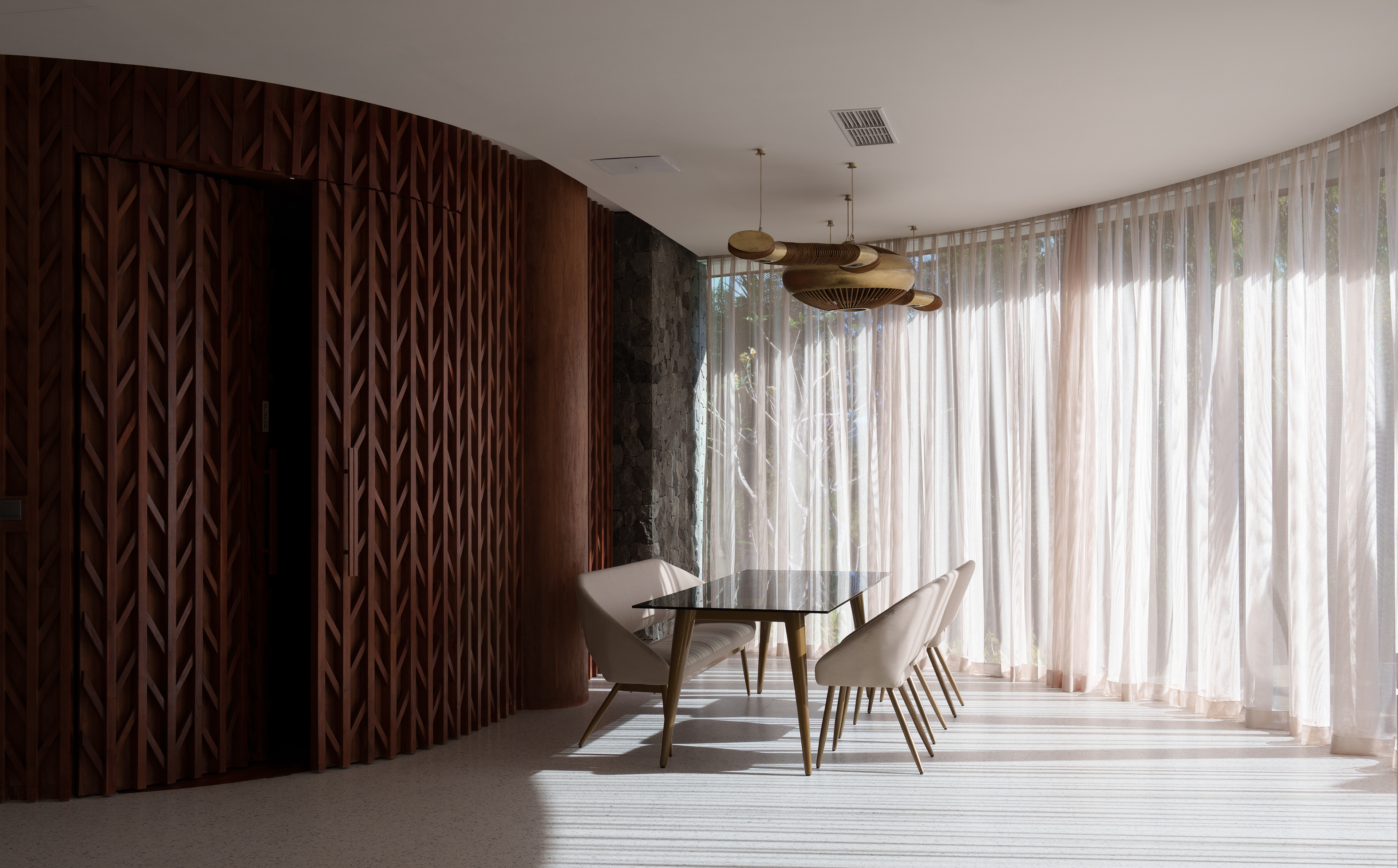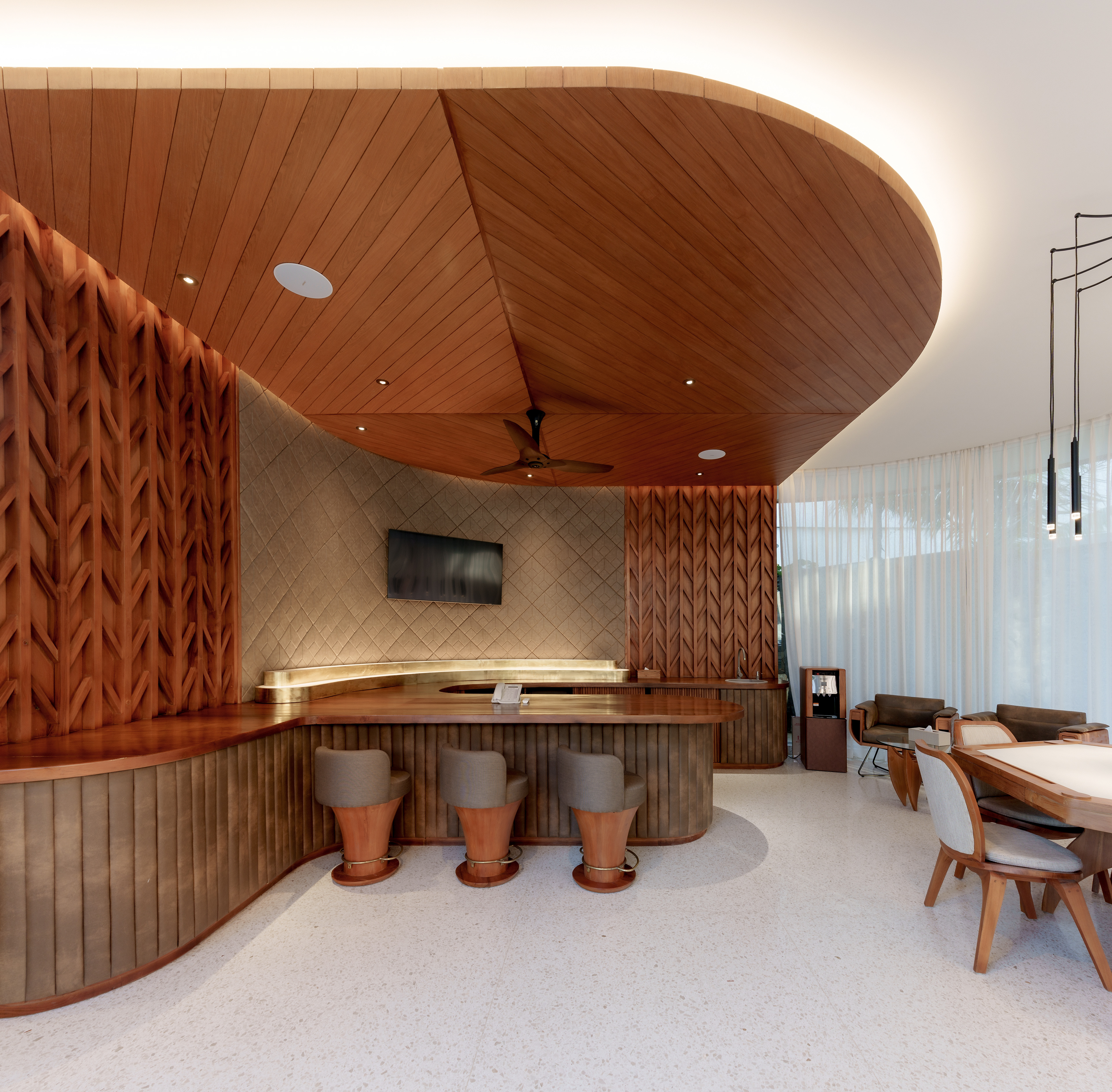 A structure has risen that refuses to be categorized — part sculpture, part sanctuary, entirely singular. Conceived with the sweeping ambition of a ship's prow and the reverence of a Balinese temple, this multi-story private villa wraps its curved, timber-clad façade around a double-volume living hall where semi-circular cream sofas orbit beneath soaring wood-slatted ceilings, as though the architecture itself choreographs the human experience within it. Project by Inspiral Architect.